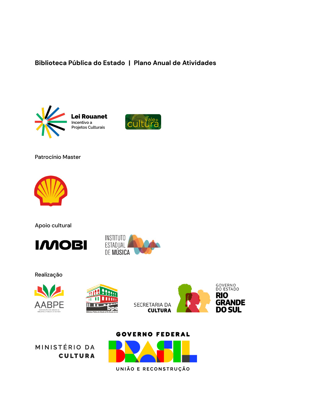 O Plano Anual de Atividades da BPE tem financiamento do Programa Emergencial Lei Rouanet RS, patrocínio master Shell, planejamento e gestão Cida Cultural, apoio Grupo Imobi e Instituto Estadual de Música (IEM), e realização da Associação dos Amigos da BPE, Biblioteca Pública do Estado, Secretaria de Estado da Cultura, Governo do Estado do Rio Grande do Sul, Ministério da Cultura e Governo Federal.
