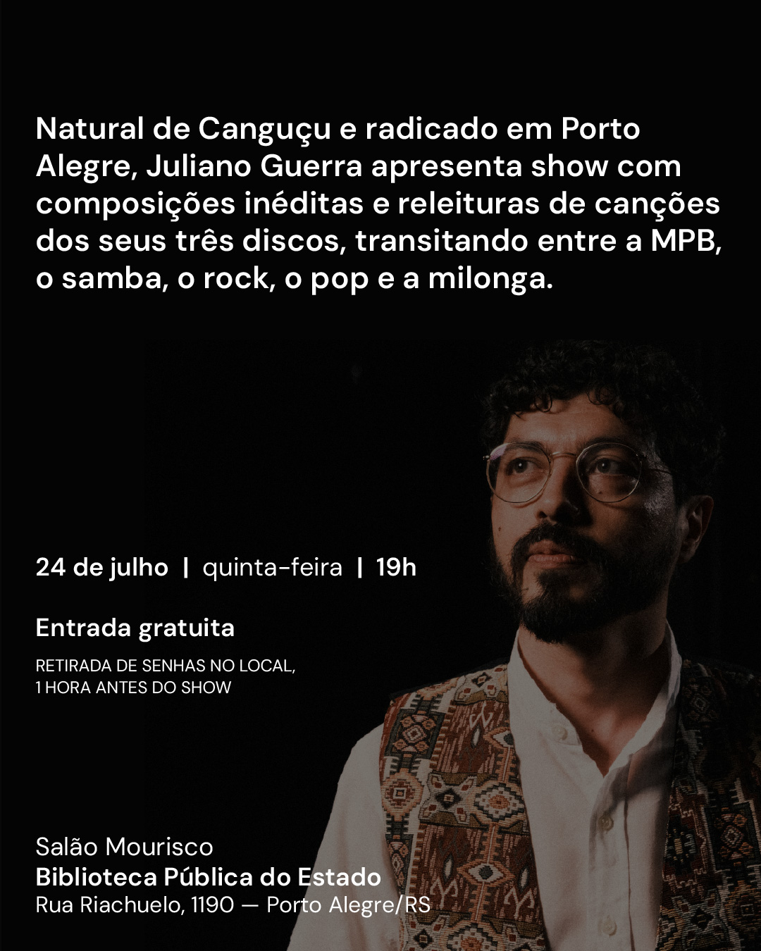 BPE + Música recebe Juliano Guerra no dia 24 de julho, no Salão Mourisco da Biblioteca Pública do Estado